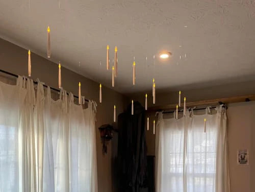 The candles use an ultra-thin transparent string that makes them look like they’re floating. Just hang the string from the ceiling or any overhead surface — from a distance, it creates a magical floating illusion.